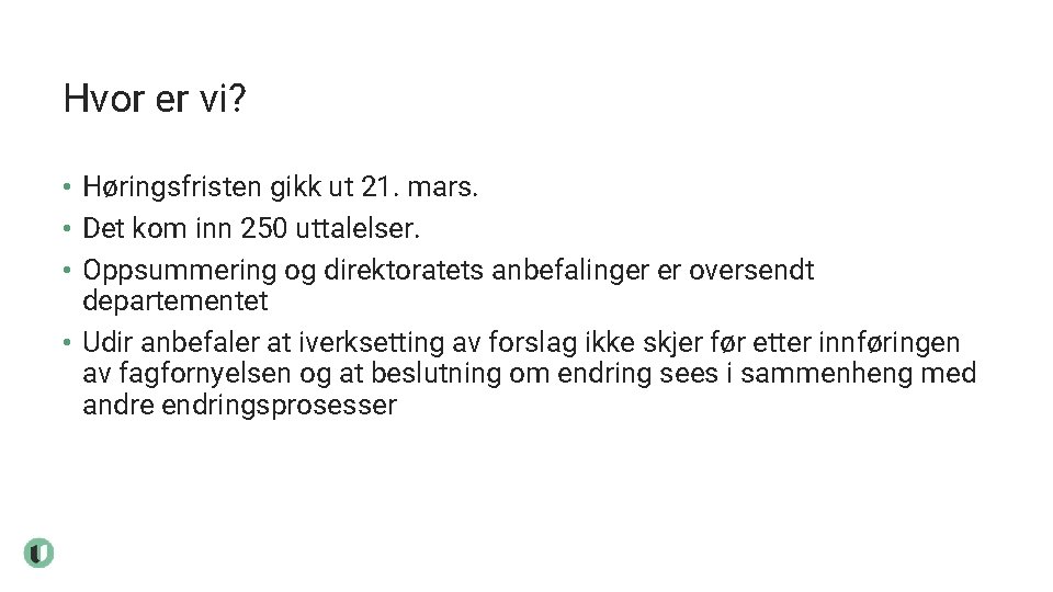 Nye læreplaner ble tatt i bruk fra 2020. Tilrettelegging av eksamen jf. Udir anbefaler at iverksetting av forslag ikke skjer før etter innføringen av fagfornyelsen og at beslutning om endring sees i sammenheng med andre endringsprosesser Til det siste punktet.